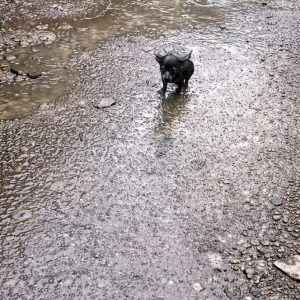 The rain poured relentlessly onto an empty roadside, where a tiny black puppy lay curled into himself. His frail body trembled without control, soaked to the bone,…