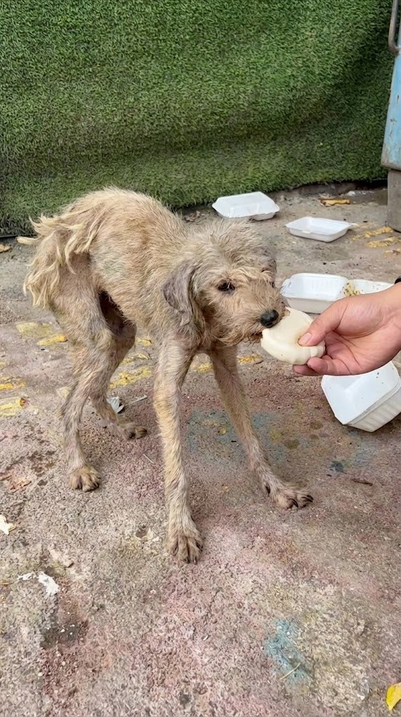 He was skeletal. His ribs protruded sharply beneath dry, tangled fur, and his legs trembled under a weight they could barely support. Hunger had erased every defining feature he once had. Whatever breed he belonged to had been lost to starvation.