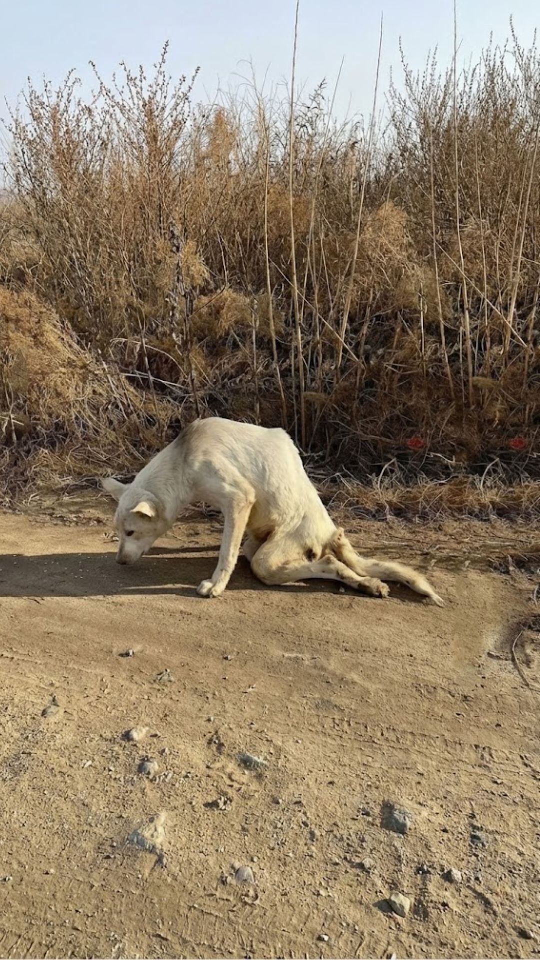His body lay twisted on the road, his eyes wide with shock and confusion. The impact had left him unable to stand, his back legs motionless beneath him.