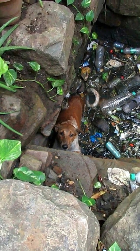 Hidden from view, buried below layers of concrete and steel, he stood chest-deep in cold, filthy water inside a forgotten drainage pit. Around him floated plastic bottles, broken containers, and thick sludge carried there by years of runoff. The walls were slick and vertical, offering no foothold, no way out. Every attempt to climb ended with his paws slipping back into the dark water below.