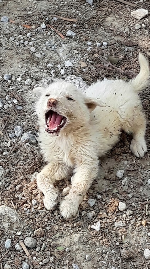 She wrapped her body around the weakest one — the white puppy — pulling him into a tight, desperate hug.