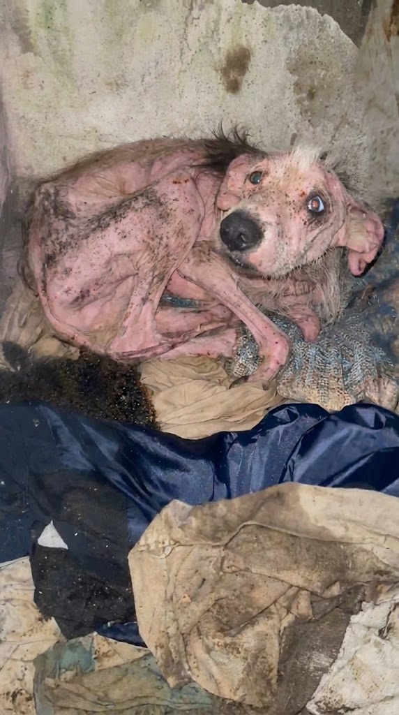 It was late at night when I saw him. Just a dog—skin and bones—sitting in a pile of trash as if the world had quietly erased him. People had walked by. People had looked away. Life had kept moving.