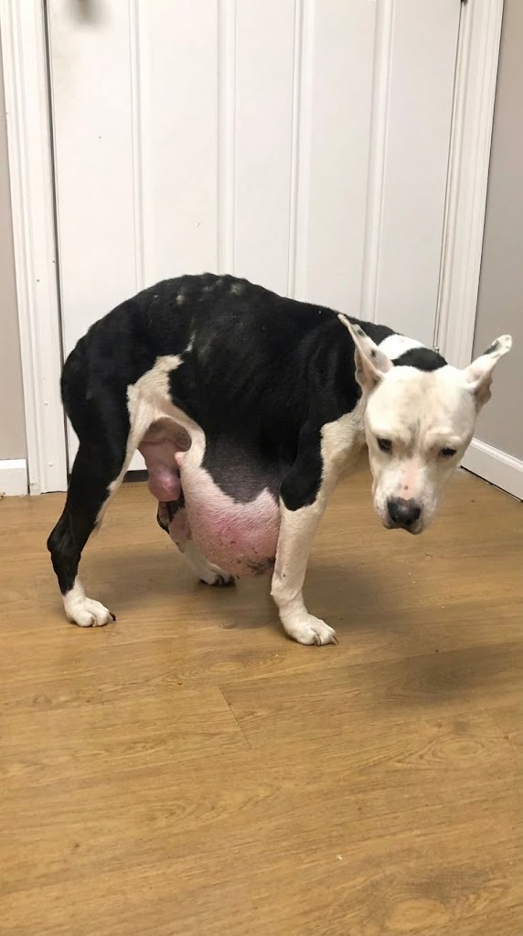 She was painfully thin, her ribs pressing sharply against her skin beneath a dull, thinning coat. Hanging from her abdomen were two large tumors—one massive and heavy, pulling her body downward with every step, the other smaller but still deeply concerning.