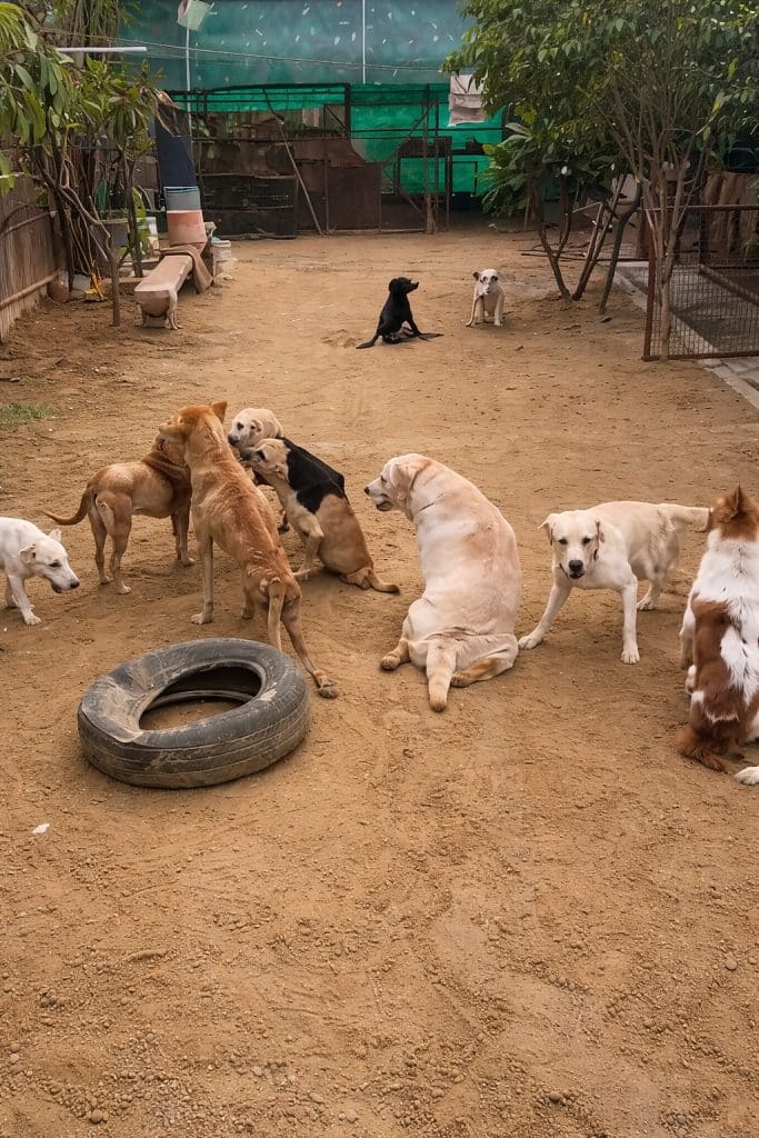Across the yard, dozens of dogs gather.