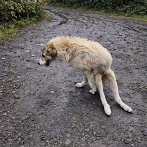 The road was empty. Rain had soaked the dirt into thick mud, turning every step into a struggle. Under a low gray sky, a small white dog…