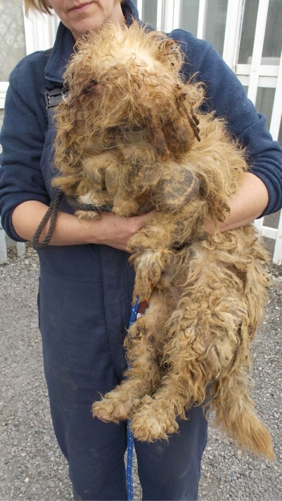Years of living in her own waste had turned her coat into a thick, solid crust. Her ears were infected. Her mouth was painful. Fleas crawled through the hardened mats.