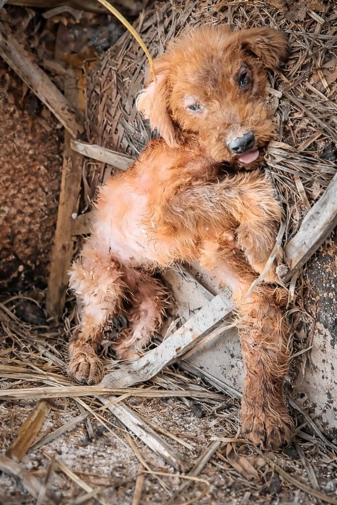 His body was so thin that every bone showed beneath fragile skin. Much of his fur had fallen away, leaving behind patches of raw, irritated skin exposed to the air.