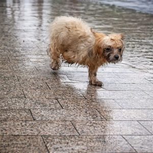 The rain had already soaked everything by the time she was found. A small dog stood near a cluster of bushes, her fur clinging tightly to her…