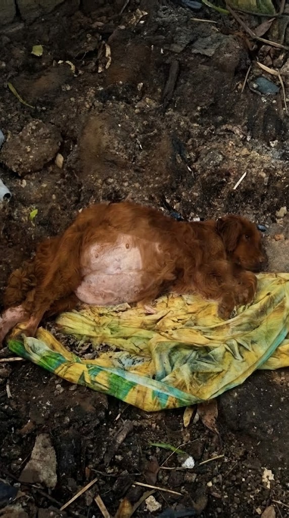 In the corner of a scorched courtyard lay a small dog chained to the same patch of ground. No shade. No clean water. No comfort. Jinni’s body looked swollen and strained, her thin legs barely able to support her weight. Her coat was dull, patchy, and lifeless—telling a story of months without care.