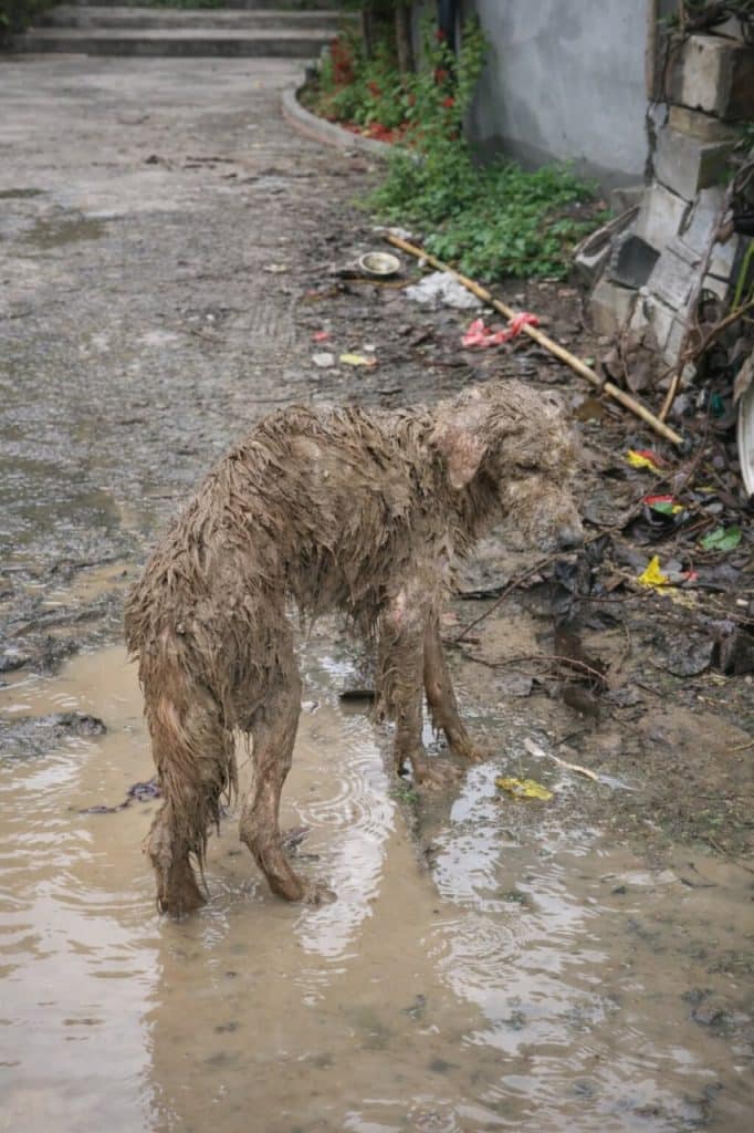 His ribs showed through matted fur. Water ran down his body with nowhere to escape. Beneath his feet—only mud.