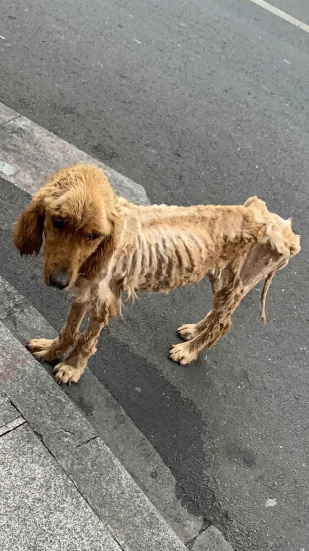 Grace was found chained to a fire hydrant on a busy street. Her golden coat was dull and thin. Her body — once strong and full — had become painfully fragile. Every rib was visible. Every step she attempted seemed to cost her strength she no longer had.