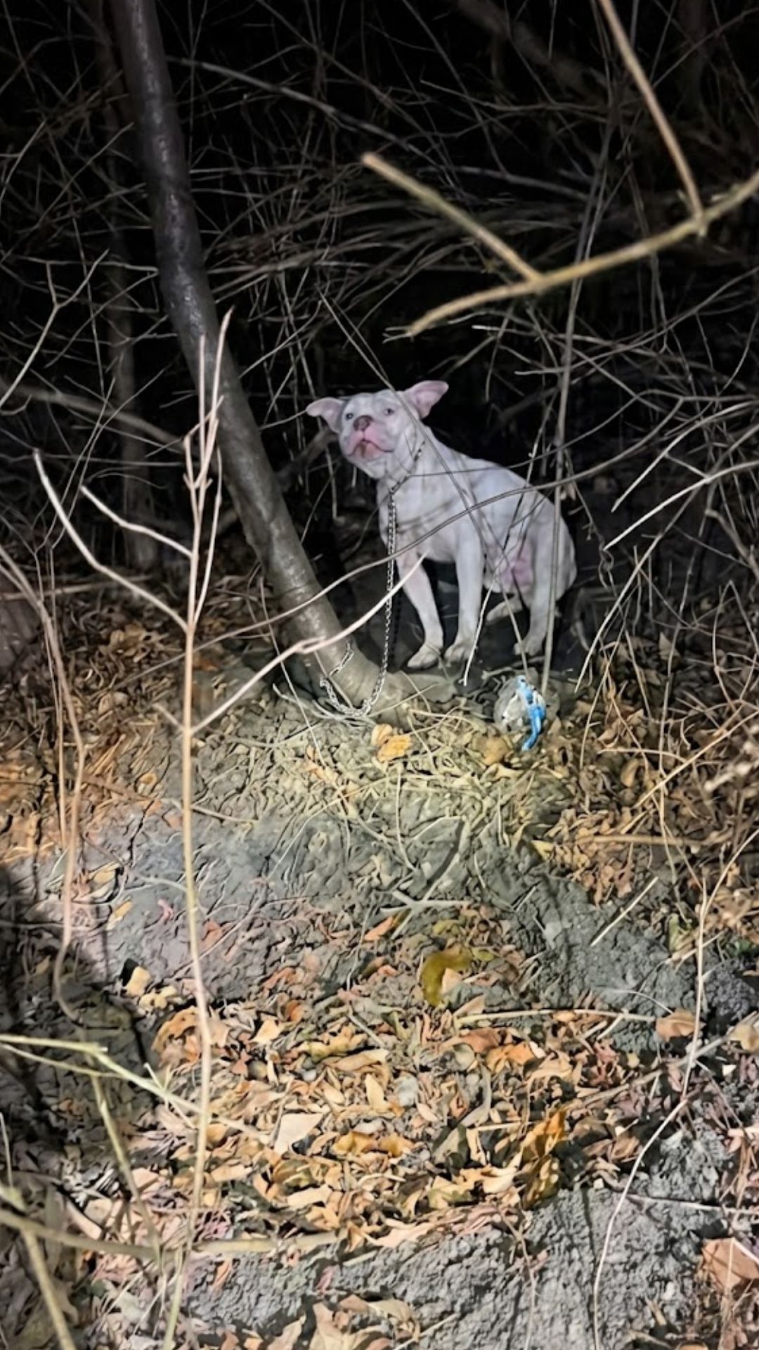A white Pit Bull mix was chained tightly to a tree with a short metal chain. No shelter. No food. No water. The temperatures had dropped to some of the coldest early-December readings in years.