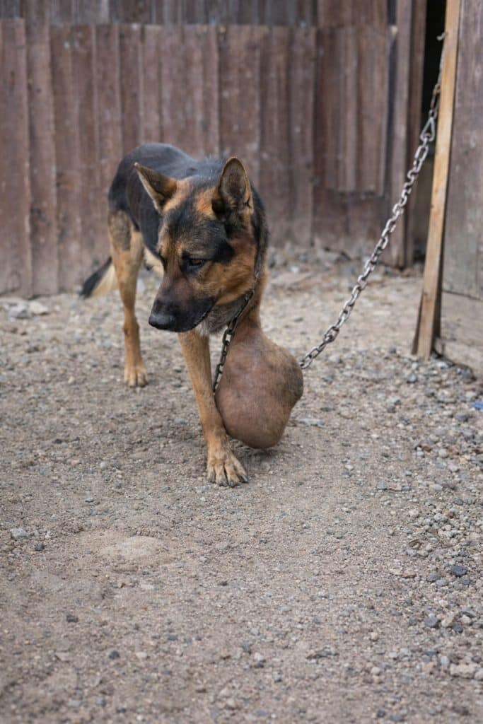 On his front leg, a massive tumor had grown — so large it was nearly the size of his head. The swelling made it hard for him to stand, and every movement looked like it came with pain.