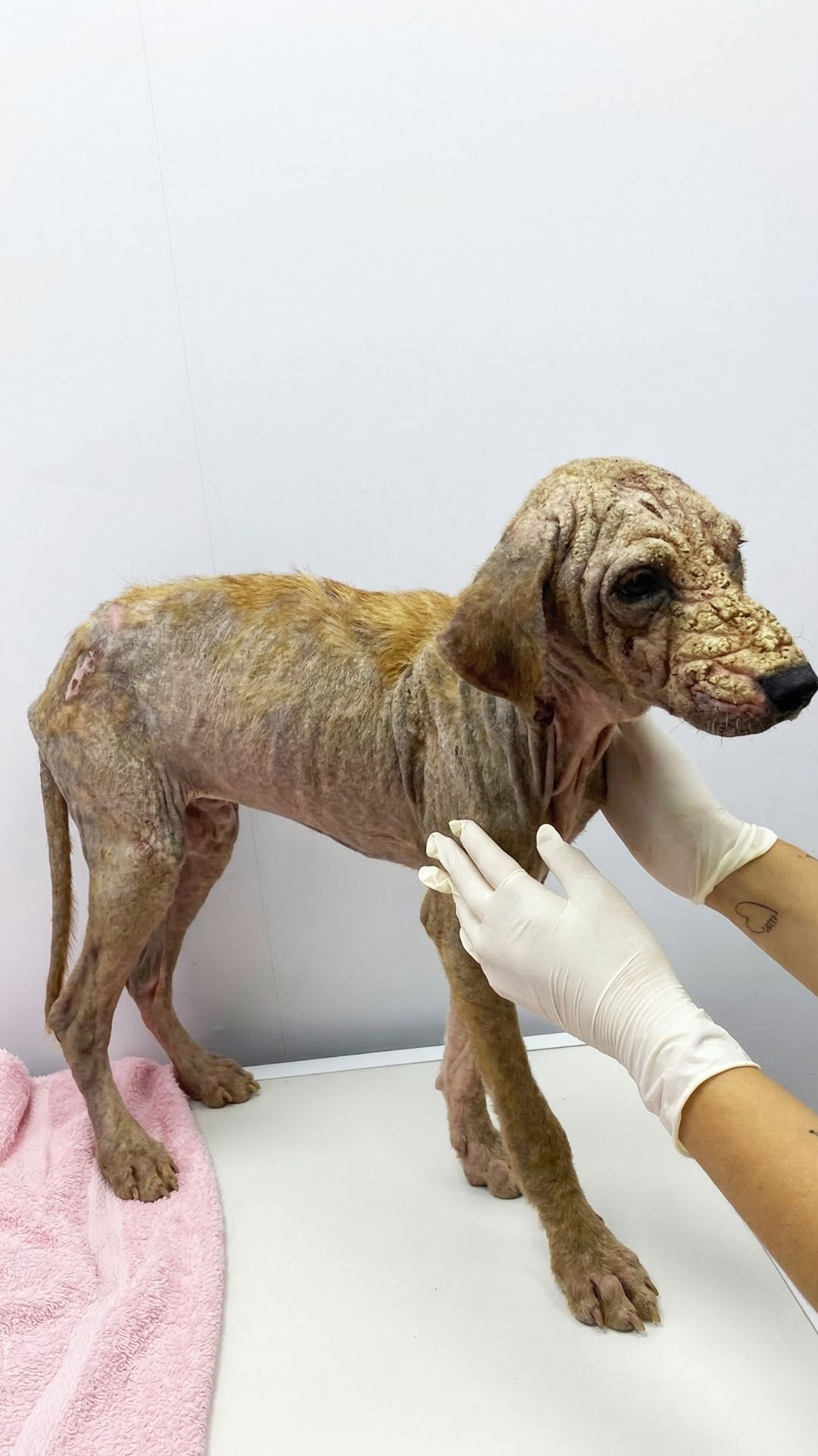 Rust’s condition was heartbreaking. His fur was almost completely gone, leaving behind cracked, inflamed skin covered in open wounds. He was painfully thin, weak from hunger, and shivering from exposure.