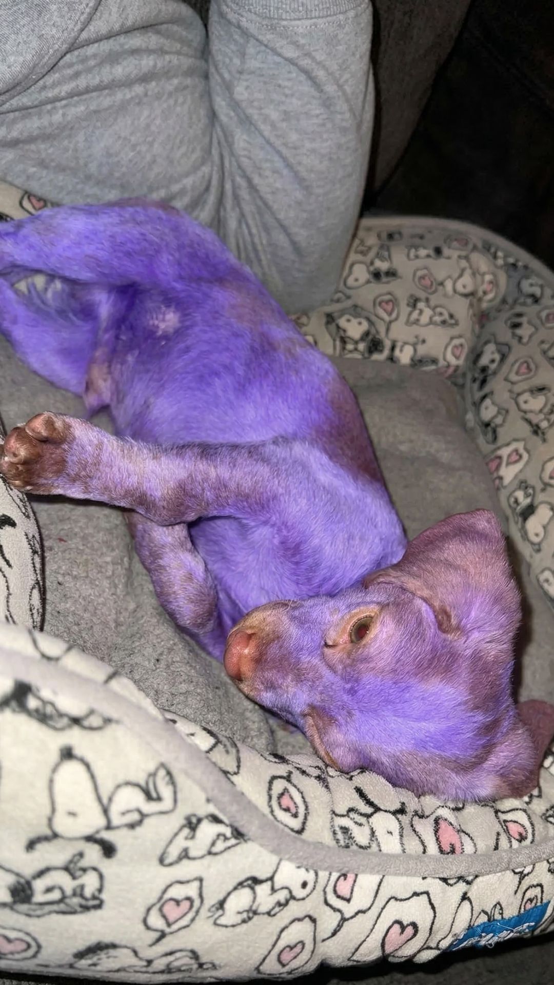 He was small, gentle, and clearly frightened. But what stood out immediately was his fur—bright, unnatural purple, covering his entire body.