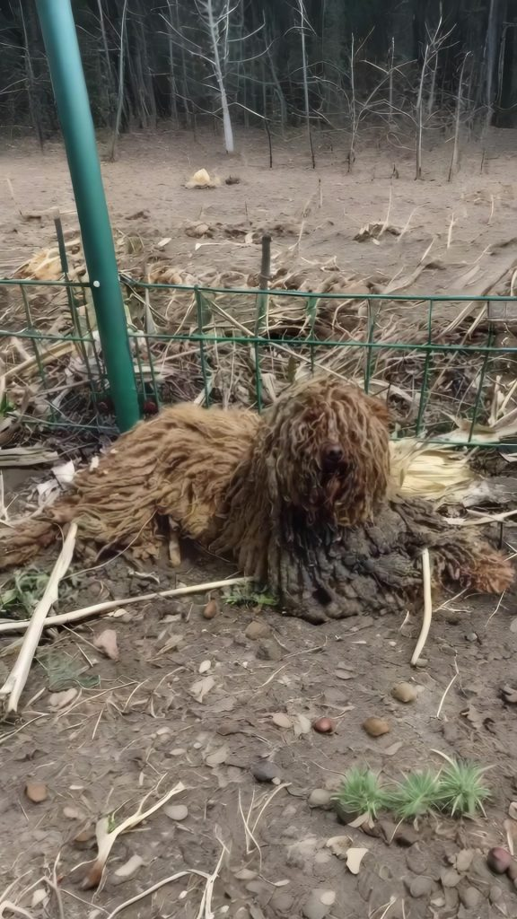 On a cold, gray morning at a quiet bus stop, a small dog lay unnoticed by most. Damp grass pressed against her thin body, and layers of dirt and tangled fur hid how fragile she truly was. She barely moved, lifting her head only slightly as people passed by.