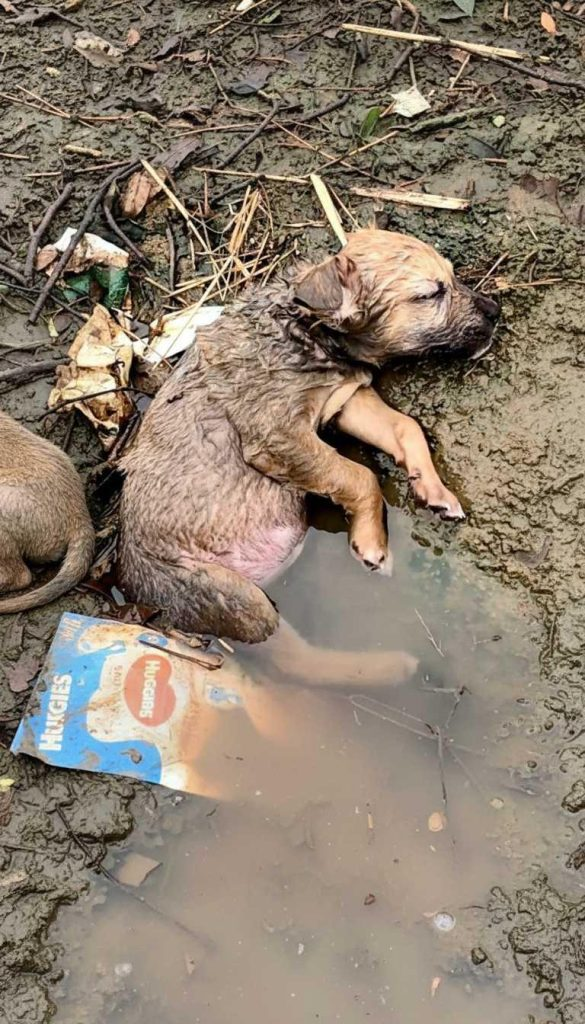 No one knew how long he had been there. Rain had fallen earlier that day, filling the ditch with cold, dirty water. The puppy’s small legs were already slipping beneath the surface. If no one had stopped, he would have quietly drowned among the trash.