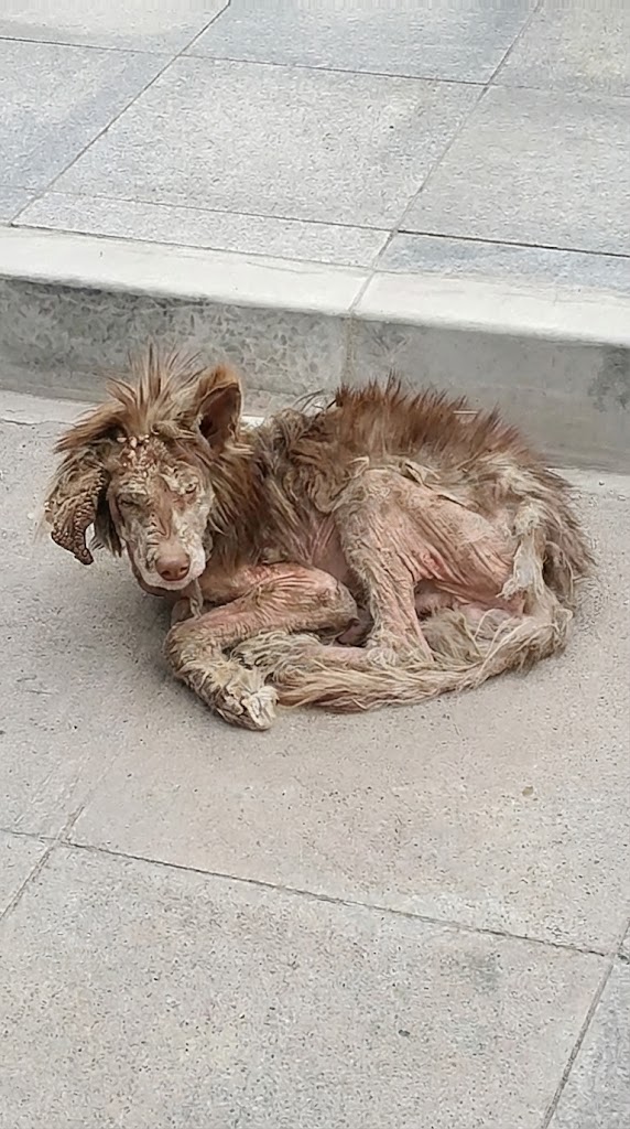 He stood on the roadside like a shadow that had forgotten its body—trembling, hollow, almost transparent. His once-magnificent coat had nearly vanished, destroyed by severe skin disease. What remained clung weakly to a frame so thin it looked unfinished, as if life itself had stopped halfway through creating him.