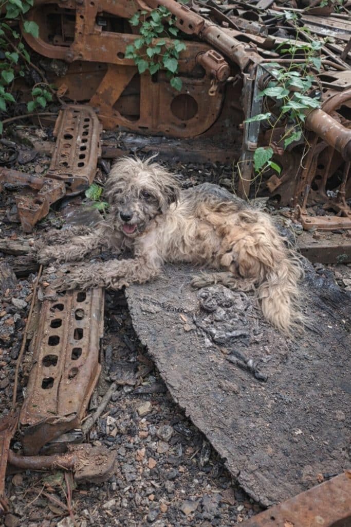 The dog who once stood still among broken machinery—