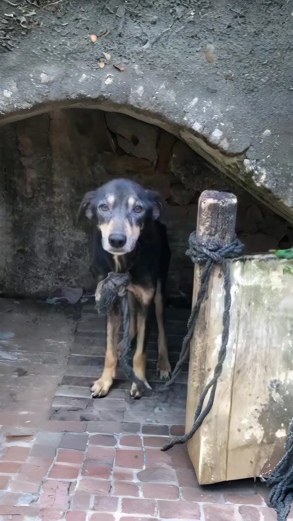 Hidden beneath a narrow stairway, Black’s world never changed. A short rope defined the limits of his life. The ground beneath him was always the same. Day after day, season after season, he remained in that small, forgotten space—thin, weak, and slowly fading into the background. Hunger shaped his body. Neglect dulled his eyes. Silence became his only companion.