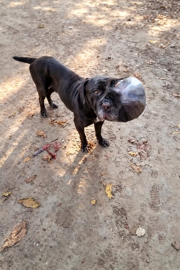 Bubbles, a five-year-old Neapolitan Mastiff mix, was found wandering alone with a massive tumor growing from the side of his face. The swelling was so large it pushed his eye out of place, distorting his features and making every movement look heavy.