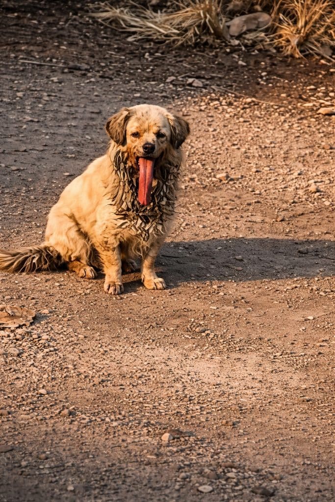 His tongue hangs downward constantly, unable to be contained. It brushes against the dirt beneath him, picking up dust with every slight movement. His fur is matted, his body thin from what appears to be long-term neglect.