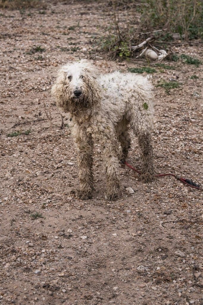 By the time the volunteer arrived, he spotted a small white figure moving slowly through the mud. From a distance, the dog almost looked like a fluffy Poodle — the kind of pet that might once have been groomed, cared for, admired.