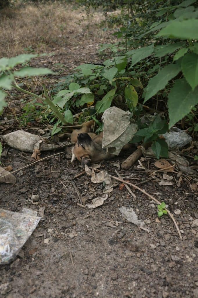 Beneath a tree, surrounded by trash and fallen leaves, a tiny puppy lay curled into himself.
