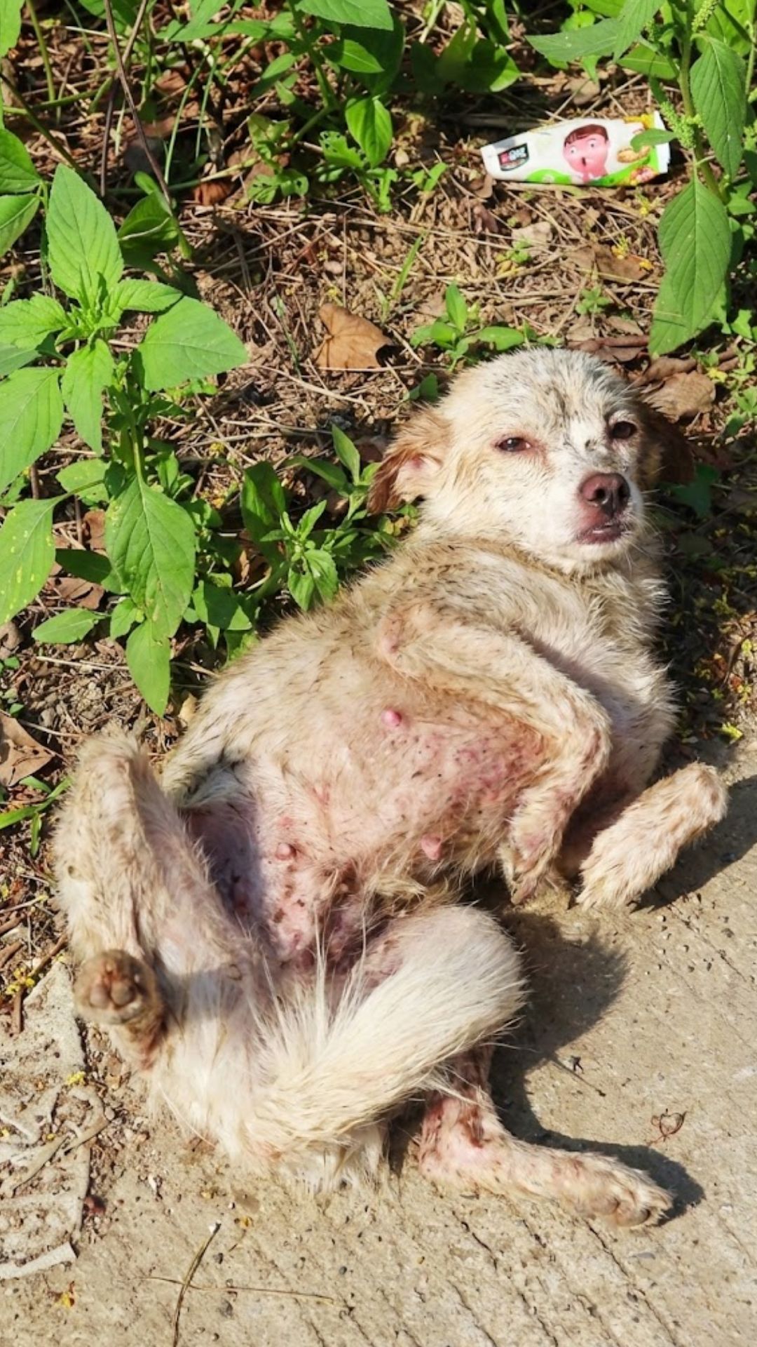 His belly was covered in red, irritated patches — likely from countless insect bites.