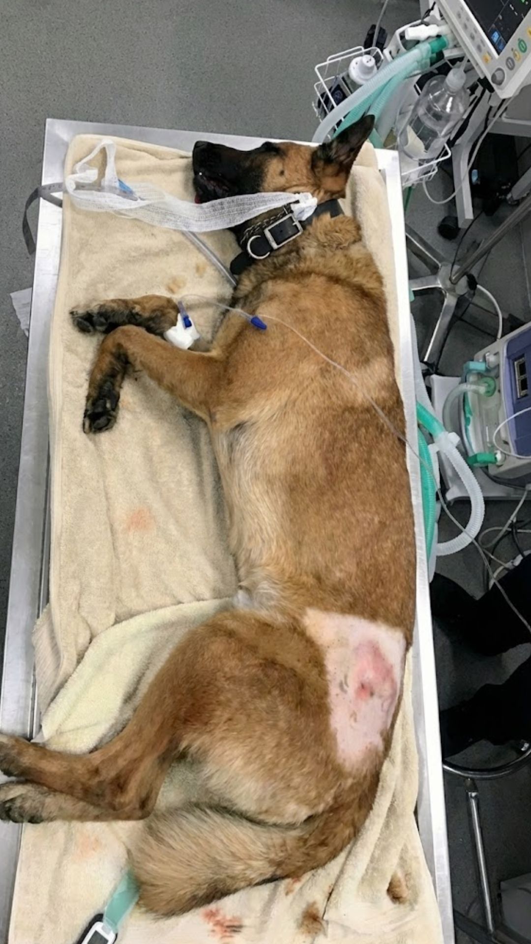 His handler—safe, but shaken—stayed by his side as they rushed him to the nearest veterinary hospital.