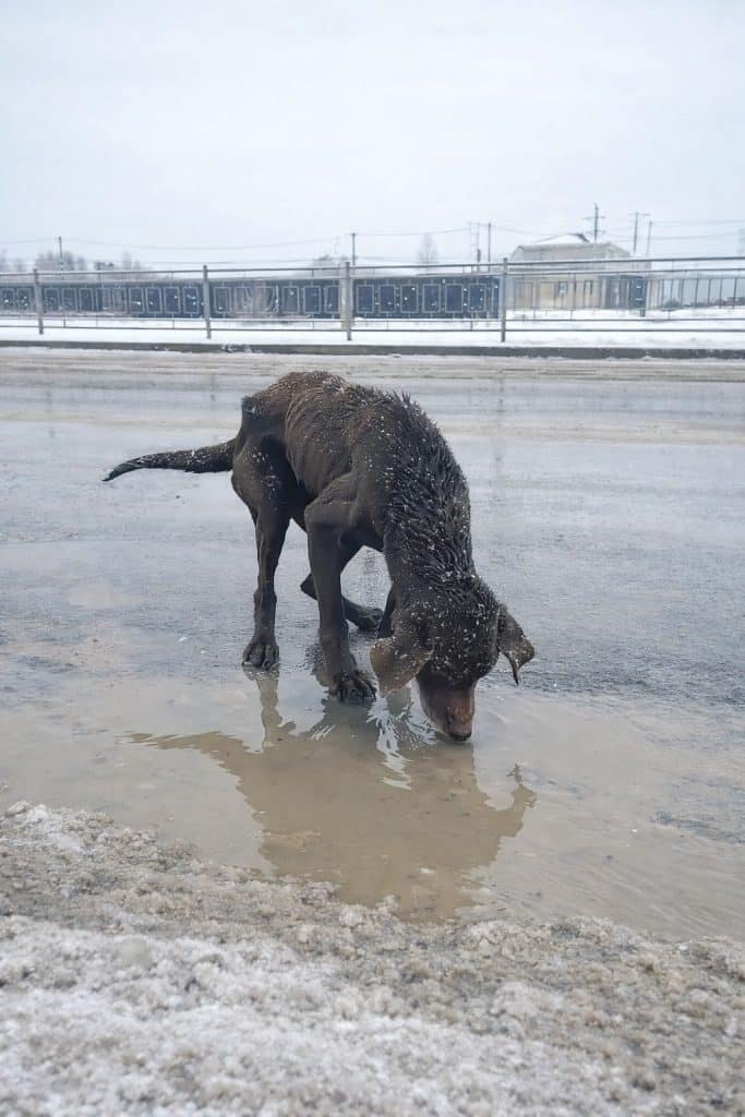 With a small dog drinking icy water because there was nothing else.