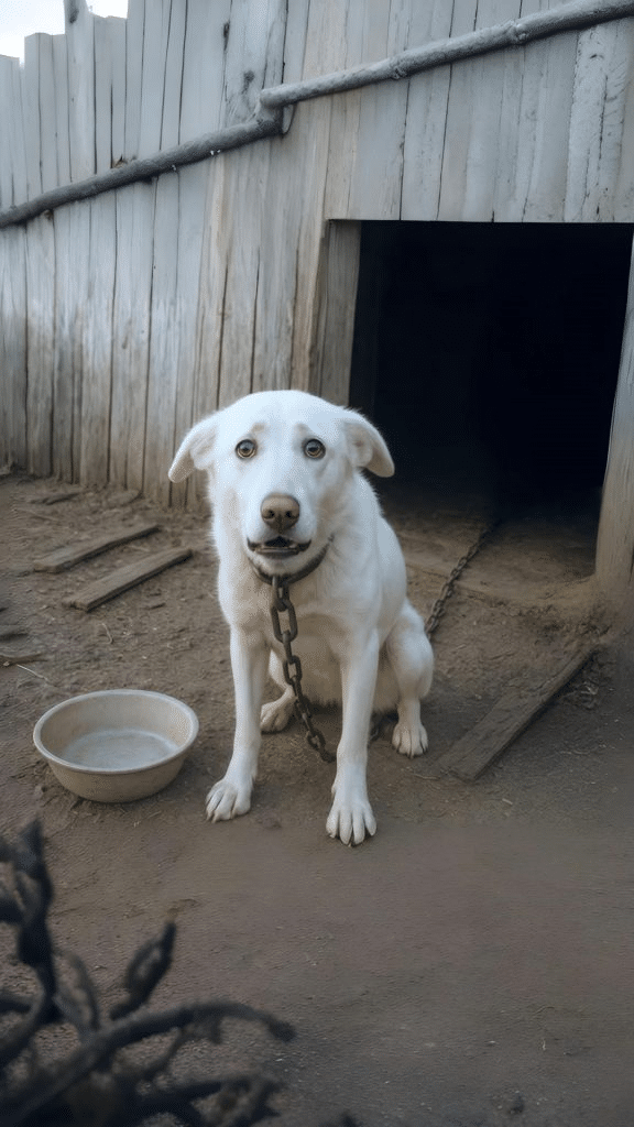 Thin, weak, and chained to a fixed point that allowed only a few small steps. His ribs were visible beneath dull fur, and the space around him told a quiet story—empty bowls, no water, nothing that suggested care.