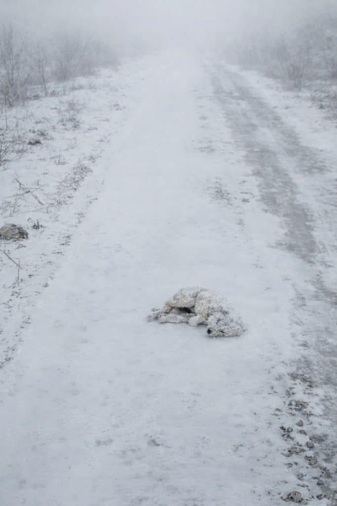 His fur stiff with frost. Snow clinging to his body as if it had already taken hold. He looked completely still—too still.