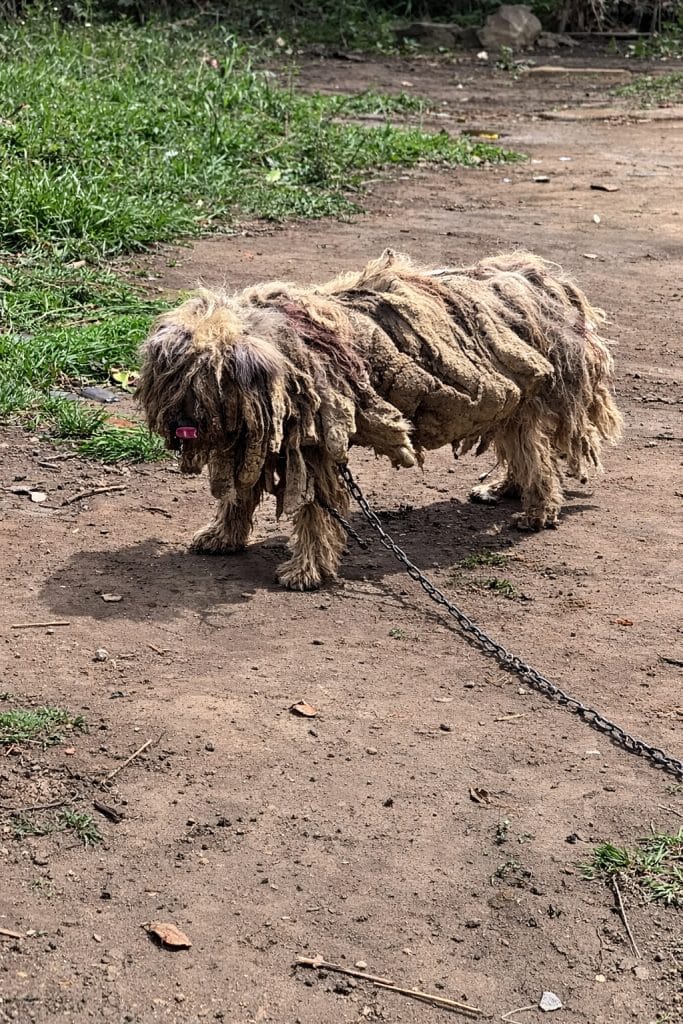 Over time, his fur had grown into something unrecognizable. Thick mats layered over one another, trapping dirt, moisture, and debris. The coat hardened into dense clumps that hung from his body like heavy fabric.