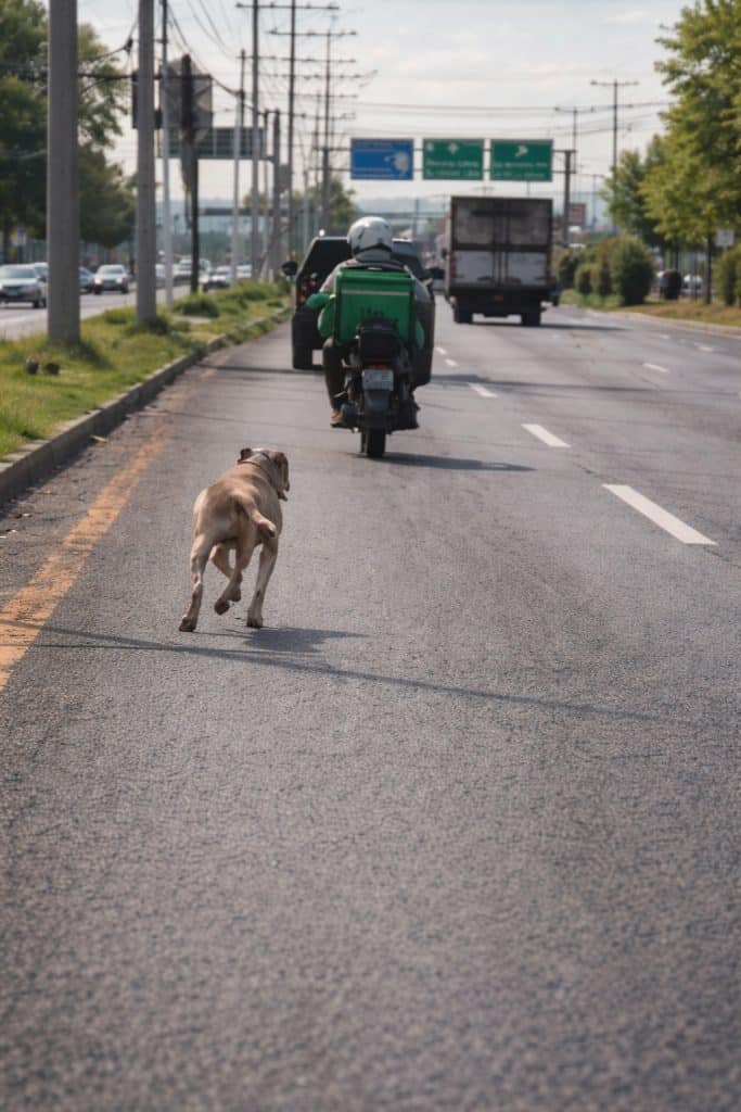 A dog sprinting along a busy road.
