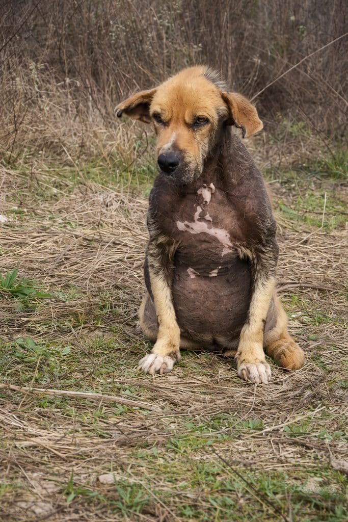In the middle of dry grass, a dog sat quietly with his body curved inward, as if trying to make himself smaller.