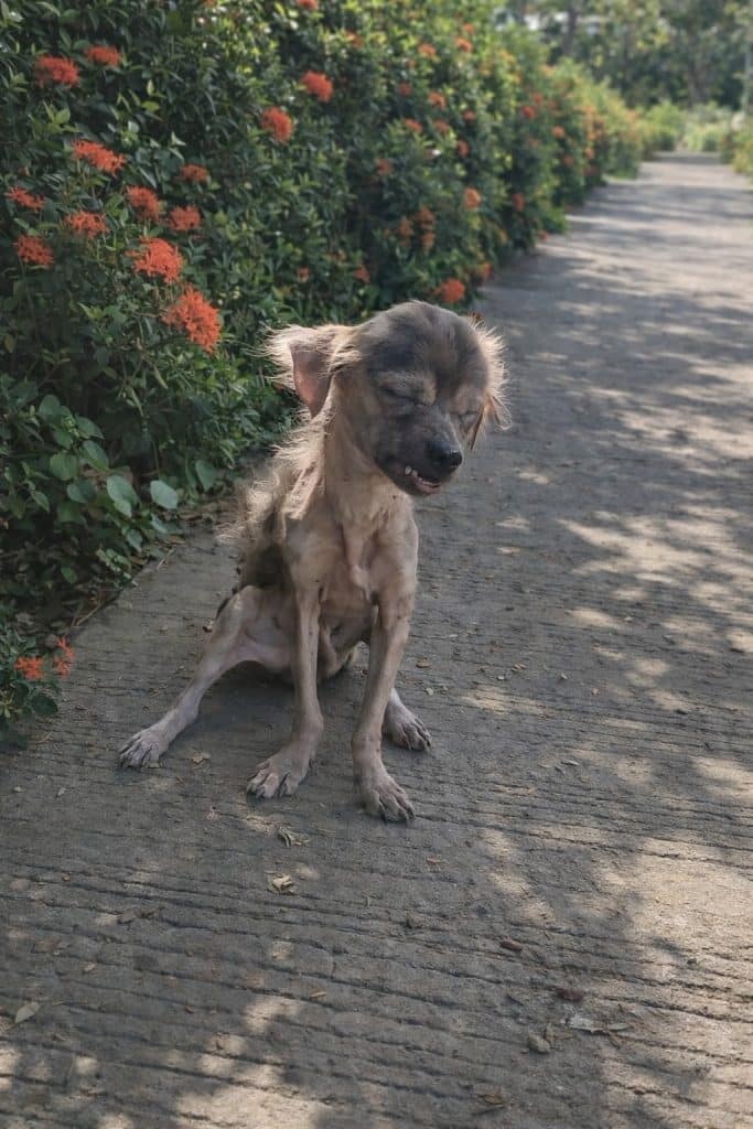 Large patches of fur were missing, exposing irritated skin and clear signs of a severe skin condition. Even sitting upright looked difficult. He leaned slightly to one side, as if the effort of holding himself up had already become too much.