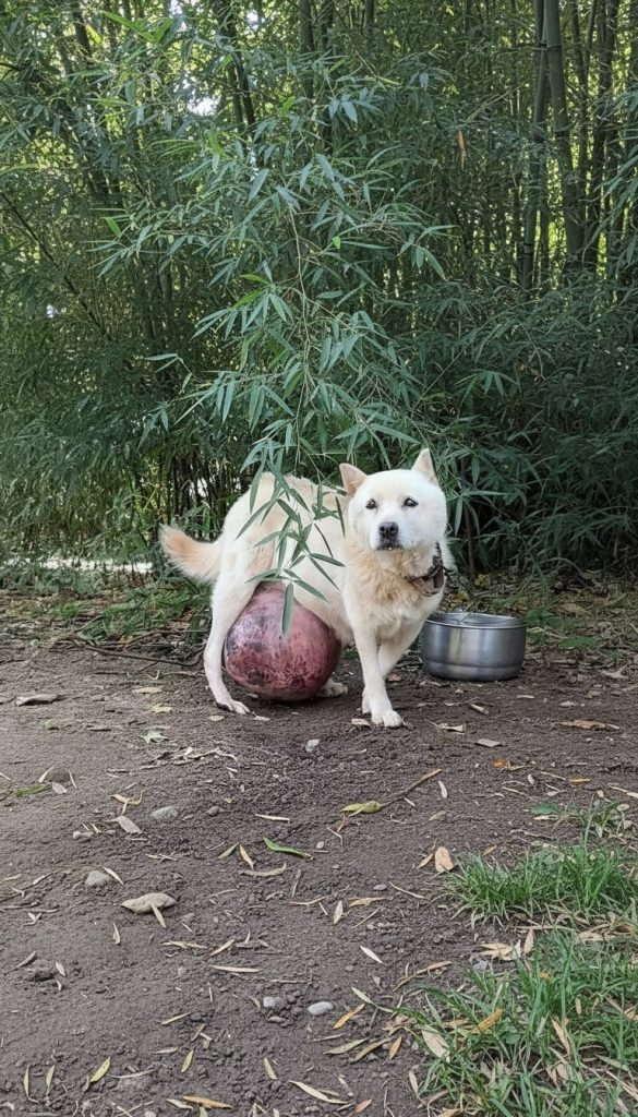 He slept where he stood. Ate whatever scraps he could find. His thin body carried a heavy burden — a large tumor growing on his lower abdomen, pulling at him with every step. Walking had become painful. Lying down offered little relief. His world had become smaller and smaller, shrinking to the length of the leash that held him.