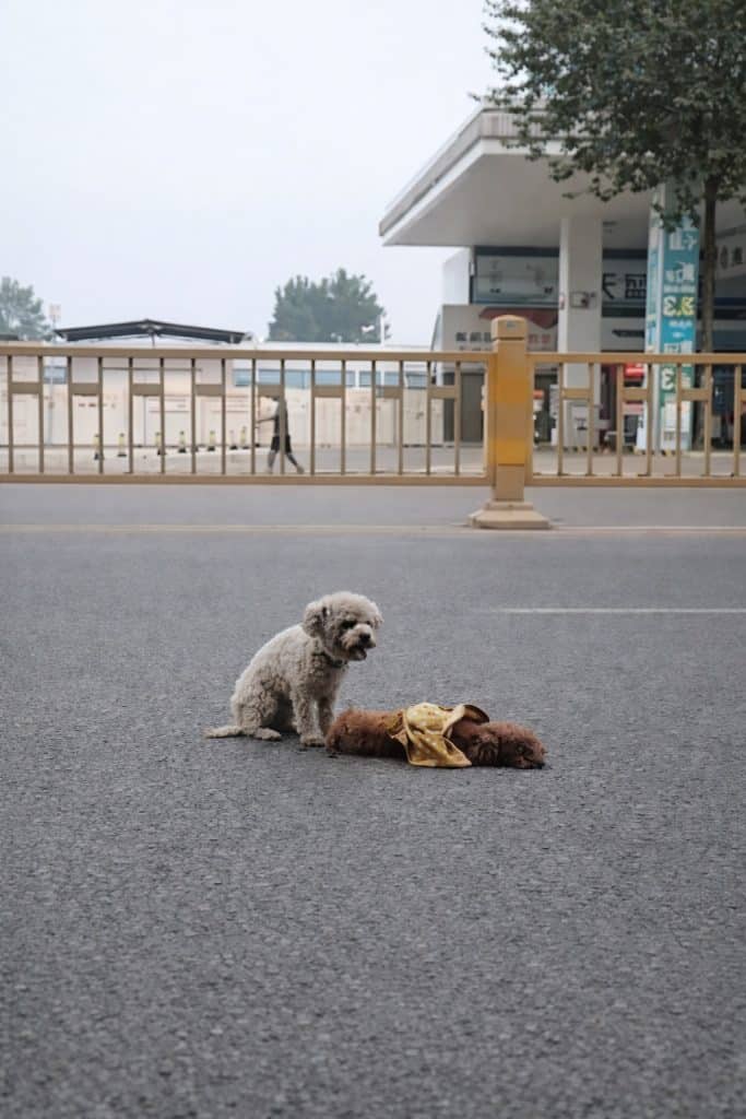 Gently, carefully, he used his mouth to pull his friend’s body toward the side of the road.