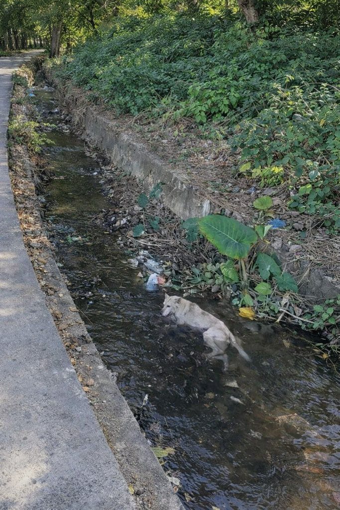 A small cream-colored dog stood quietly in a murky ditch—