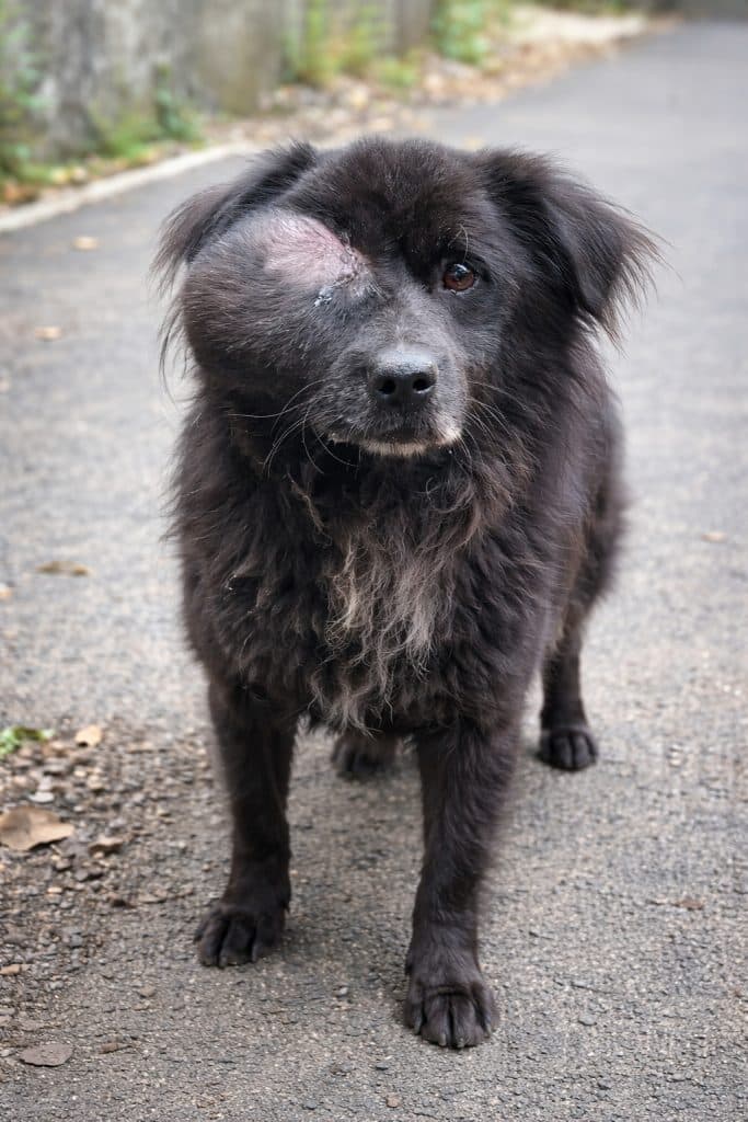 One of his eyes was completely hidden beneath a large tumor, distorting his face and blocking his vision. His paw was badly infected, his nails overgrown and curled painfully into his skin.