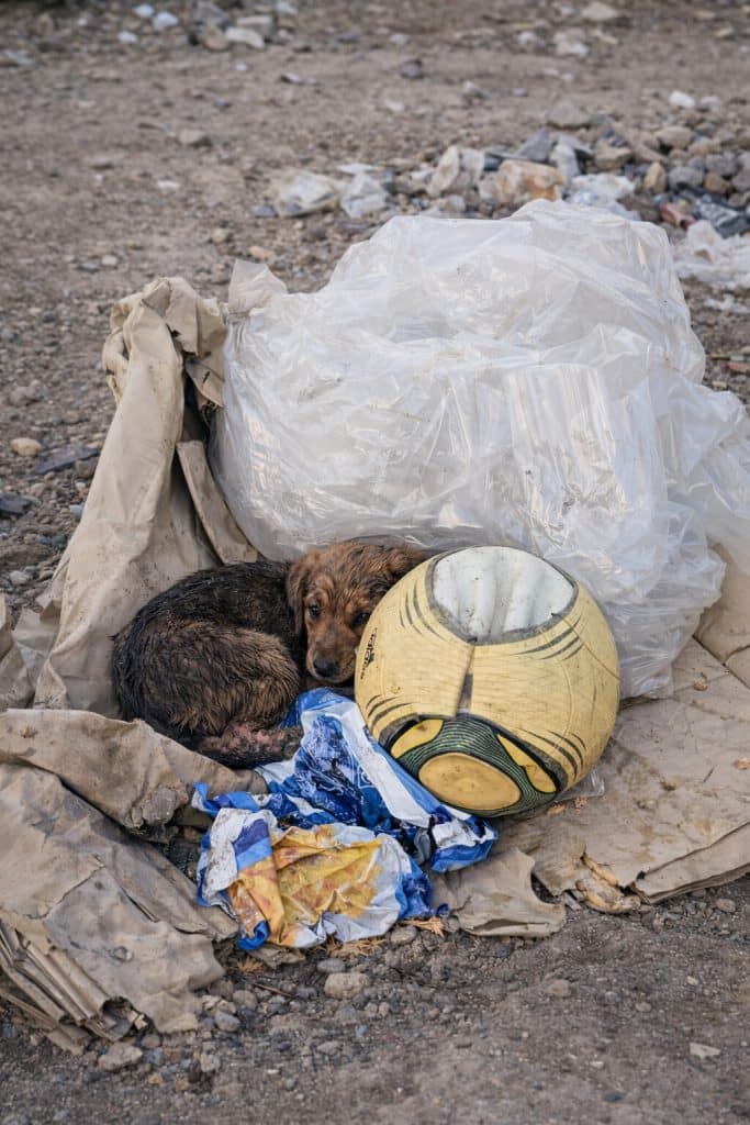Beneath plastic bags and roadside debris, a tiny puppy pressed himself into the dirt—