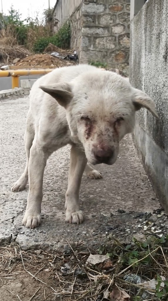 On a dusty road, a white dog moves slowly, almost mechanically. His steps are uneven. His body is so thin that every rib presses against the skin like a quiet confession of time passing without comfort.