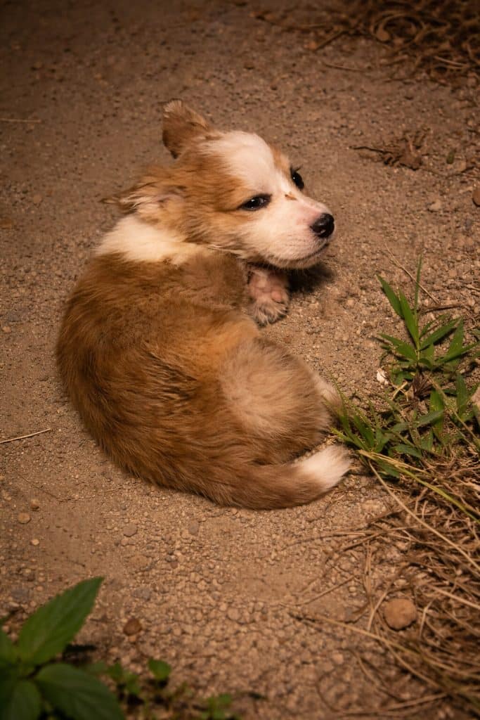 A tiny Corgi—lying still near the roadside.