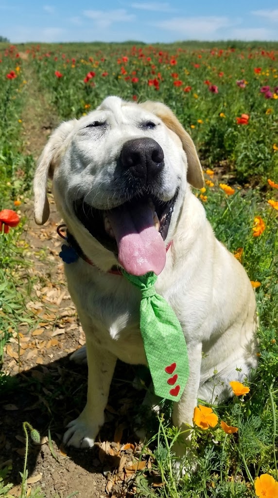 She smiles, kneels down beside her yellow Labrador, and answers gently: