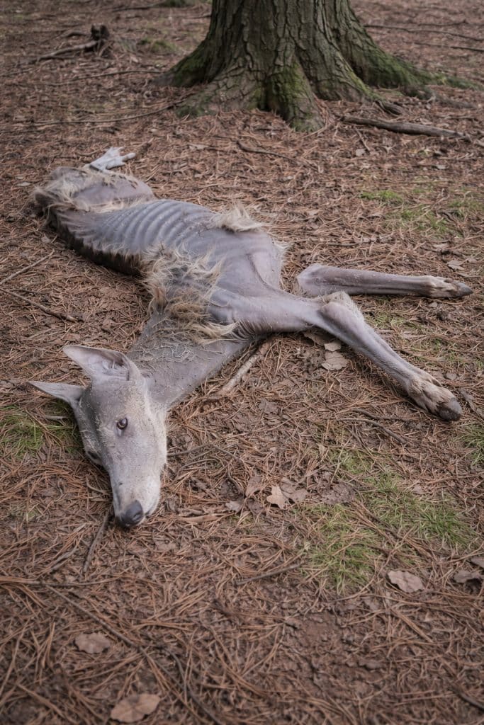 So thin its body seemed to disappear beneath its skin. Bones pressed sharply through dull fur. No movement. No strength left to run.
