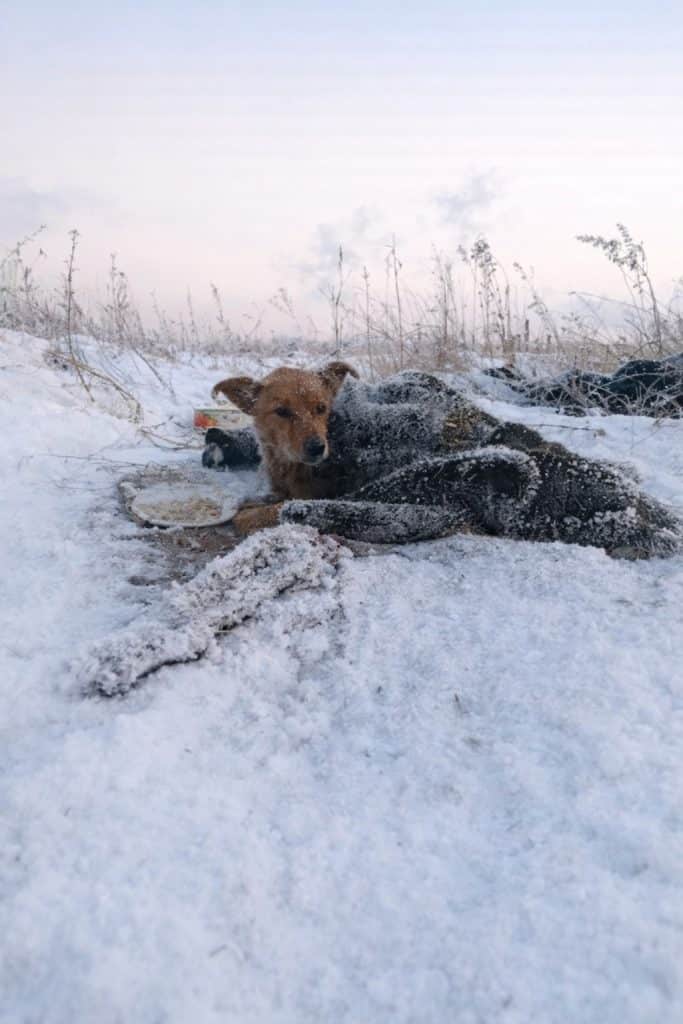 Alone in the middle of a snow-covered field, his body lay almost completely still. Ice clung to his fur. His thin frame had gone stiff from the cold. Only the faintest breath proved he was still alive.