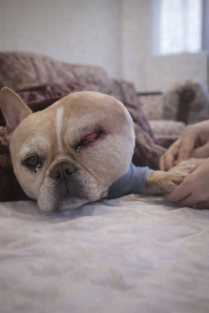 His left cheek distorted, stretched, and infected.