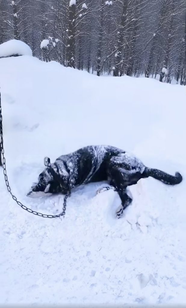 Following the sound behind a small, snow-covered house, a passerby discovered a dog standing alone in the freezing cold. He was tied to a short chain attached to a wooden post, unable to move far in any direction.