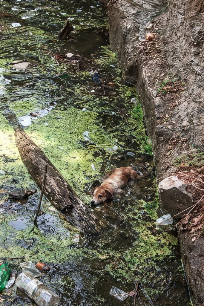 Stagnant green water.